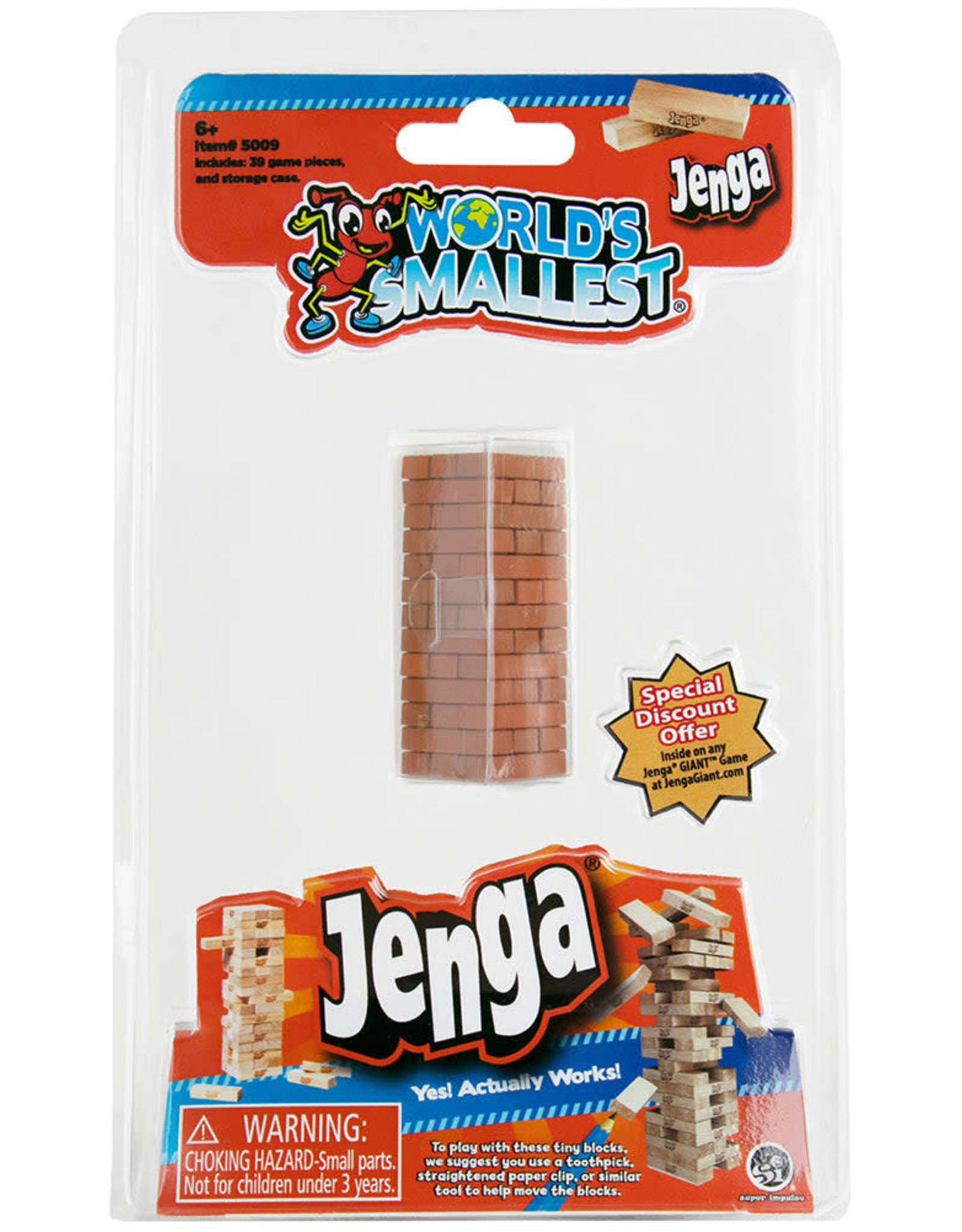 Jenga, the original wood black game that families have loved for generations, is now available in the world's smallest size! Measuring less than 2.5" tall, this game packs all competitive block-stacking fun of Jenga in a miniature form.